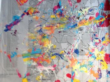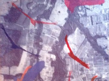 Large topographic maps,rescued and repurposed as substrate for prints; combining the faded grey, of the once 'blue print' maps with: new color, life, verve...and continuance.