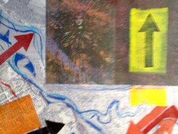 The stained glass saint represents WISDOM. She gazes down from the sky to the topography below. Is she radiating wisdom to the inhabitants below; or pining at the lack of wise living that she sees? Arrows direct our eye into the cycle of observation, and awareness, leading us back to wisdom.